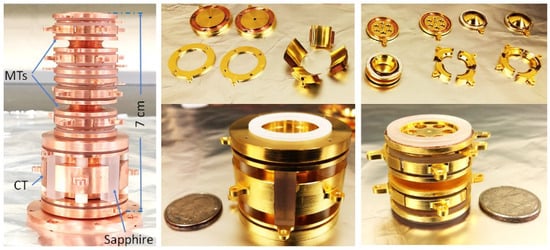 Pictures of the CHIP-TRAP Penning traps. Left: the assembled hyperbolic measurement traps stacked on top of the capture trap before the electrodes were gold plated. Middle: the cylindrical capture trap after gold plating, consisting of two end caps, two correction ring electrodes and quartered ring electrodes. Right: the hyperbolic measurement traps after gold plating, consisting of hyperbolic ring and end-cap electrodes, quartered correction ring electrode and correction tube electrodes. The two traps are stacked together in the bottom picture. Sapphire insulating rings can also be seen in the pictures.