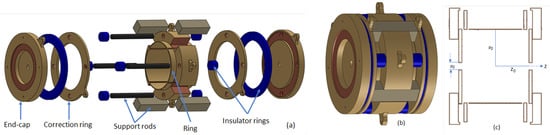 Schematic drawing of a measurement trap: (a) exploded view—copper colored components are the electrodes, blue components are insulators, and brown components are insulated support rods; (b) assembled view; (c) cross-sectional outline with labeled dimensions.
