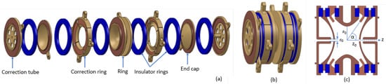 Schematic drawing of the capture trap: (a) exploded view—copper-colored components are the electrodes, blue components are insulators, and brown components are insulated support rods; (b) assembled view; (c) cross-sectional outline with labeled dimensions.