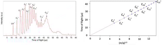 The LAS was initially commissioned in a test stand [] and then installed in the CHIP-TRAP beam line; see Figure 2. Initial commissioning in both cases was performed by using carbon cluster ions as described in Section 2.1.1. The ions were transported along the beam line, and their arrival time at the MCP detector was recorded. This enabled a TOF spectrum to be built up from repeated cycles of ion production from the pulsed laser. An example TOF spectrum for C ions is shown in Figure 9 (left). Equation (5) was used to estimate the TOF for the C ions and make an initial identification of the peaks in Figure 9 (left). This identification, and the confirmation of Equation (5) was made by plotting TOF vs. () as shown in Figure 9 (right). The location of the C peaks clearly follows the expected relationship. Interestingly, the TOF of the first peak was consistent with an = 13 u/e rather than 12 u/e for C ions. Hence, we assume this peak to be due to CH.