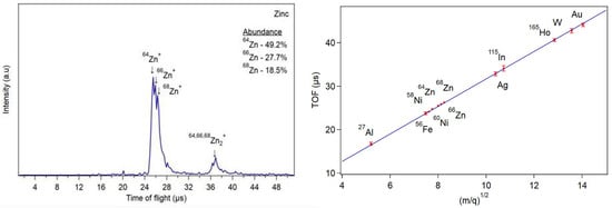 After this initial commissioning, we tested ion production from metal targets, which were typically 2.5 cm × 2.5 cm × mm thick. We investigated production from a range of materials, including Al, Fe, Ni, Zn, Ag, In, Ho, W and Au. An example of a TOF spectrum for Zn ions is shown in Figure 10 (left). As can be seen for Zn, atomic ions were the dominantly produced ions, but dimer ions were also observed. For lighter ions, such as Zn, peaks corresponding to the different isotopes were observed. For heavier ions, such as Ag, W, and Au, the different isotopes could not be resolved, and a single, broad peak was observed in the TOF spectrum. As with the C clusters, we produced a plot of TOF vs. (), which is shown in Figure 10 (right) for the metal target ions. Again, TOF vs. () followed the expected linear relationship of Equation (5).