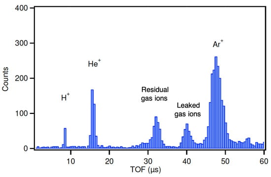 Time-of-flight spectrum for ions produced with the PITS and detected on the MCP. The residual gas ions were identified as HO or HO, and the leaked gas ions as N.