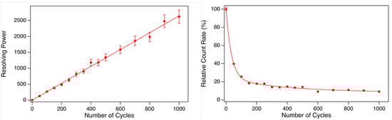 Initial commissioning of the MR-TOF-MS was performed using ions produced with the LAS. We were able to successfully implement the “in-trap lift” method [] to capture and release ion bunches in the MR-TOF-MS. We manually tuned the timing and voltage settings for the MR-TOF-MS to maximize efficiency and resolving power, i.e., reduce losses over as long of a capture time as possible. Our initial investigations focused on trapping Al ions. We were able to trap Al for 1000 cycles in the MR-TOF-MS, corresponding to a trapping time of ≈9 ms and a path length ∼500 m. We observed a linear increase in resolving power vs. cycle number, reaching 2500 after 1000 cycles, as shown in Figure 12 (left). However, as can be seen in Figure 12 (right), the count rate quickly drops off within the first 200 cycles. This is due to the fact that the initial spread of the pulsed beam from the LAS is larger than the acceptable spread for trapping in the MR-TOF-MS.