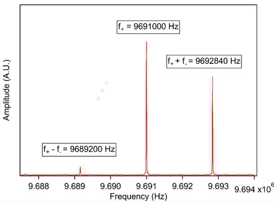 After confirming that we could create and detect ions, we looked for the mass-dependent reduced-cyclotron motion by using a dipole drive sweep near the cyclotron frequency of HO. This ion species was chosen since it was expected to be present when ionizing residual background gas as observed previously in other systems, e.g., [,]. We did observe a peak at 9.69 MHz, consistent with that of an ion having = 19 in an ≈12 T magnetic field. In addition to the peak at 9.69 MHz in the frequency spectrum, we also observed sidebands at about 1.8 kHz higher and lower in frequency than the peak; see Figure 13. These sidebands are a result of the ions also having magnetron motion with frequency , resulting in frequency components at () in the FFT []. The presence of magnetron motion when it is not explicitly driven is likely due to ions not being made at the trap center or from self-excitation of the ion cloud. Additional studies with the capture trap included the characterization of the capture trap trapping potential by measuring and as a function of and , respectively, for different correction electrode voltages. This method can be used to “tune” the trap so as to minimize the lowest-order electrostatic field imperfection, characterized by the parameter [,,]. Further details are available in Ref. [] and will be presented in a forthcoming publication.