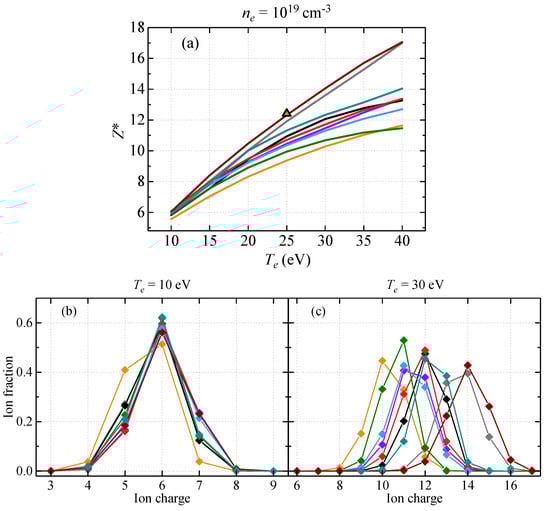 First, for the lowest temperature case ( eV), we see that all codes predict a similar value of . This convergence in is reflected in Figure 1b, where only minor differences in the shapes of the CSDs are observed between most codes. The plasma conditions (high-density, low-temperature) place it close to LTE conditions, and thus, agreement between the codes in this region is expected, as only the atomic structure matters in determining the ionization balance in LTE. With increasing electron temperature, increases alongside an increased spread in the various code predictions. This is most apparent for temperatures above 30 eV, where predictions of span six charge states. As the electron temperature increases, the plasma moves away from LTE conditions and enters the non-LTE regime, a regime known for producing disagreements among collisional-radiative codes [64]. It should be noted that the calculations shown in gray, dark red, and the single gold triangle (with a black border) were performed under the assumption of LTE conditions. These LTE calculations, which are equivalent to performing Planckian radiation field-driven non-LTE calculations with , naturally overestimate the plasma ionicity given that we have specified eV in the current problem. The spread in predictions likely originates from differences in the dielectronic recombination rates, a supposition suggested by investigations undertaken in the non-LTE code comparison workshops [64]. Atomic model completeness, most notably extensive consideration of autoionizing channels, is an important aspect of ionization balance calculations [64,65], which will be addressed in a future iteration of this workshop.