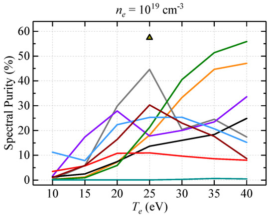 In Figure 2, we present calculations of the spectral purity (SP) of these plasmas. Unlike the calculations, no general trend exists among the codes. First, we note that the LTE submissions (gray and dark red curves, gold triangle) predict a peak in the SP for eV. This plasma condition generates an average charge state for all three LTE submissions (see Figure 1a). Although the codes agree on , the spread in SP is significant: 30% (dark red curve), 45% (gray curve) and 60% (gold triangle). In Figure 3, we plot the emissivity of the eV plasma as calculated by the dark red curve and gold triangle submissions. The atomic model associated with the dark red spectrum includes an extensive number of multiply excited states in the atomic structures, and transitions from such states lead to significantly more emission in the 5–13 nm region than for the spectrum shown in gold. This latter spectrum exhibits (i) more intense in-band emission and (ii) less “out-of-band” emission than the dark red spectrum. Both of these factors contribute to the higher spectral purity for the spectrum shown in gold. Returning to Figure 2, we note that the green and orange non-LTE submissions exhibit a steep rise in SP for 20 eV, where a maximum in the SP is most likely attained for eV. The blue and bright red submissions, on the contrary, predict a slowly varying SP with temperature, both of which peak for (SP = and , respectively). Finally, we note the local SP maximum for the purple curve at eV is non-physical, arising from a misplaced shifting of spectral lines.