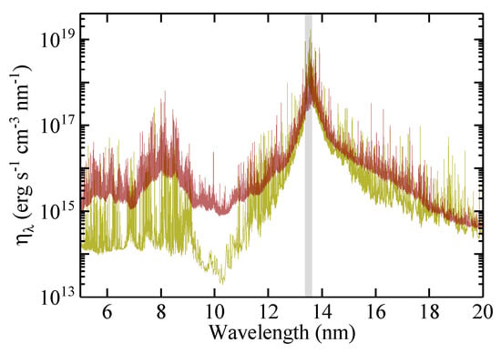 Emissivity of a cm, eV plasma as calculated by the dark red and gold triangle LTE submissions. The gray shaded area represents the nm in-band region.