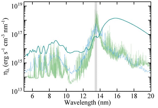 The absence of a common trend among the non-LTE submissions shown in Figure 2 is perhaps not too surprising considering (i) the substantial spread in predictions for eV (Figure 1a), (ii) code-to-code variations in the extensivity of the atomic structures and (iii) the rather narrow bandwidth (0.27 nm) associated with the in-band region. This is exemplified in Figure 4, where we plot the emissivity of plasmas having for the green, blue, and dark cyan non-LTE submissions ( and 25 eV plasmas, respectively). The dark cyan emissivity is clearly very different from that of the green and blue emissivities, the latter of which predicts substantially less in-band emission than the spectrum shown in green. It is well known that the atomic structures of Sn–Sn ions are subject to strong configuration effects, and this makes their accurate calculation notoriously difficult [20,66]. Extensive benchmarking of these level structures with charge state-specific experimental spectra [67,68,69,70,71] and/or highly accurate ab initio atomic structure calculations [70,72,73] is very much required. Experimental measurements of emission from multiply excited states are also highly desired given their dominant contribution to EUV emission from laser-driven, mid-Z plasmas [23,74,75].