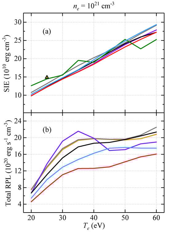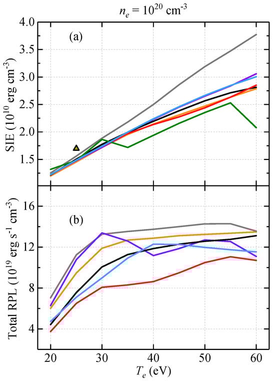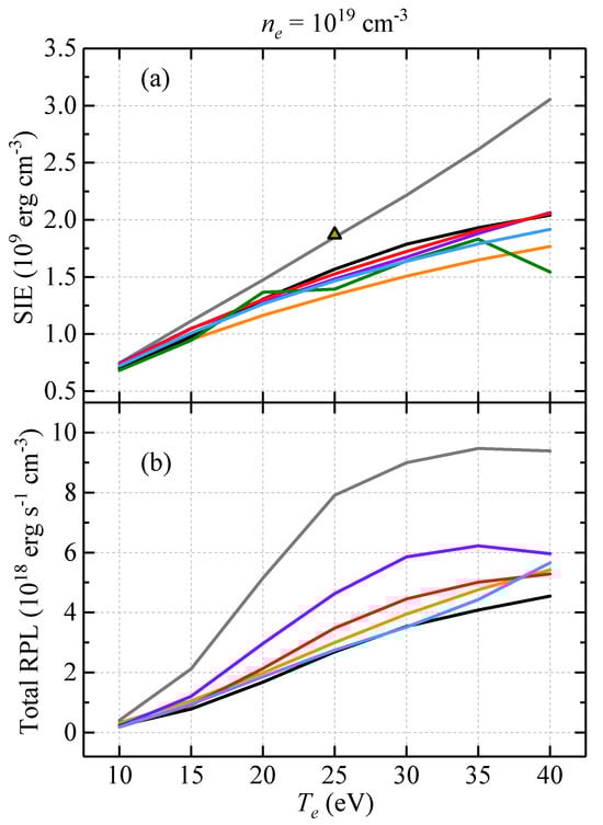 (a) Specific internal energy (SIE) and (b) total radiative power losses (RPL) as a function of for cm. The gray and gold triangle submissions were calculated under the assumption of LTE conditions.