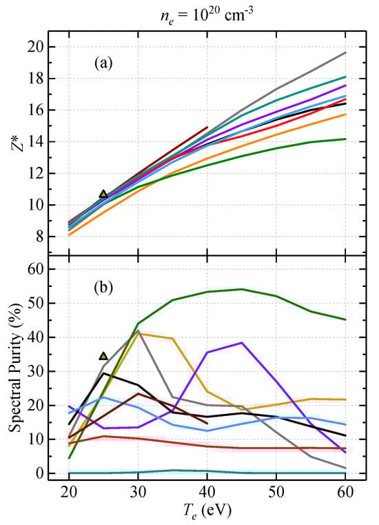 (a) Average charge state and (b) spectral purity as a function of for cm. The gray and dark red curves, as well as the gold triangle submission, were calculated under the assumption of LTE conditions.