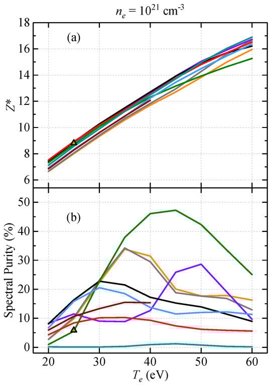 In Figure 1a we present computations of the average charge state of tin plasmas having cm and eV. This electron density is of particular relevance for industrial applications as it corresponds to the critical electron density for CO lasers currently used to drive EUV source plasmas for nanolithography [15,63]. The charge state distributions (CSDs) of the eV and 30 eV plasmas are shown in Figure 1b and c, respectively.