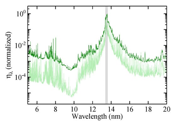 - Behnke, L.; Schupp, R.; Bouza, Z.; Bayraktar, M.; Mazzotta, Z.; Meijer, R.; Sheil, J.; Witte, S.; Ubachs, W.; Hoekstra, R.; et al. Extreme ultraviolet light from a tin plasma driven by a 2-µm-wavelength laser. Opt. Express 2021, 29, 4475–4487. [Google Scholar] [CrossRef]