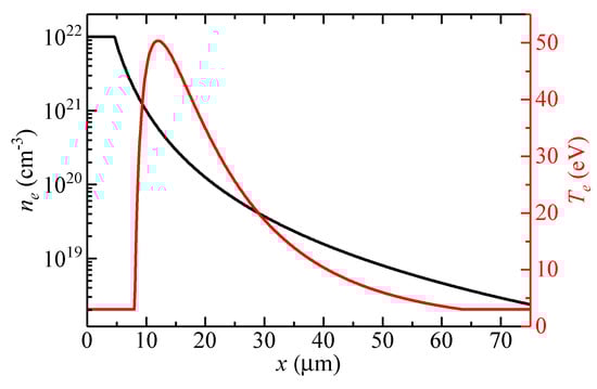 Profiles of the electron density (black) and electron temperature (red) for µm in the laser absorption case study. Note that the computational mesh extends to µm.