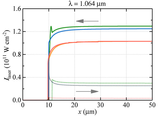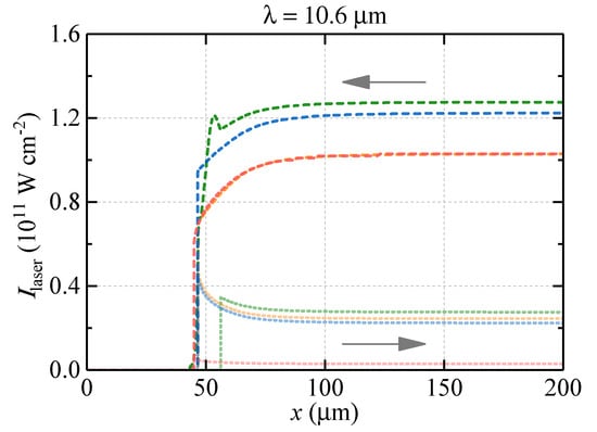 Finally, we plot in Figure 16 the laser absorption coefficient as a function of distance x for the µm and 10.6 µm laser cases. An approximate form for can be written [78]