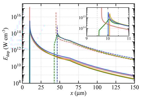 Laser energy deposition as a function of distance x. Solid lines correspond to the µm case, and the dashed lines correspond to the µm case. The inset figure provides a zoomed-in view near the critical density of the µm case.