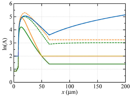 Coulomb logarithm as a function of distance x. Solid lines correspond to the µm case and dashed lines correspond to µm.