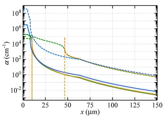 Laser absorption coefficient as a function of distance x. Solid lines correspond to the µm case and the dashed lines correspond to the µm case.