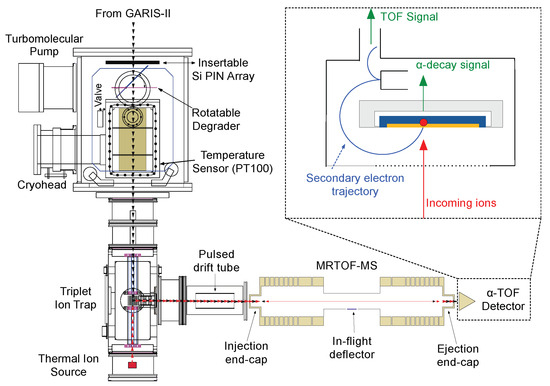 - Niwase, T.; Wada, M.; Schury, P.; Haba, H.; Ishizawa, S.; Ito, Y.; Kaji, D.; Kimura, S.; Miyatake, H.; Morimoto, K.; et al. Development of an “α-TOF” detector for correlated measurement of atomic masses and decay properties. Nucl. Instrum. Methods Phys. Res. Sect. Accel. Spectrometers Detect. Assoc. Equip. 2020, 953, 163198. [Google Scholar] [CrossRef]