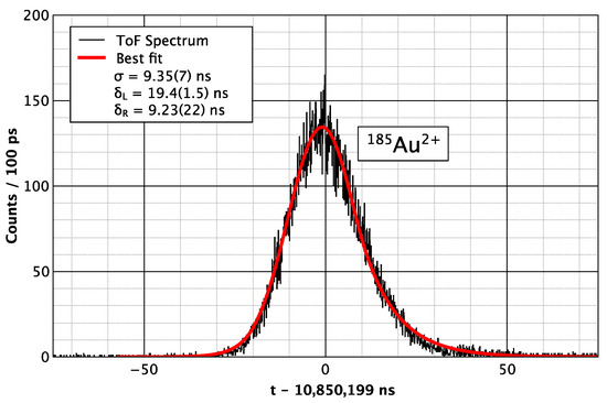 Time-of-flight spectral peak of Au produced online in V(La, p4n)Au reactions. The peak shape can be seen to be well-reproduced by the fitting function. The measurement was performed prior to the recent upgrades, and the mass resolving power is = 2.5 × 10.