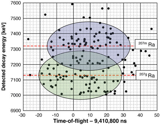 Moreover, the use of decay-correlated time-of-flight mass spectroscopy allows for an opportunity to resolve low-lying isomeric states that would otherwise be unresolvable with the available mass resolving power of the spectrograph. An example is given in Figure 3 using data published in Ref. [23]. The isomer and ground state of Ra requires a mass resolving power of at least 3.5 × 10 to resolve, which exceeded the capability of our MRTOF-MS at the time of the measurement. In Figure 3, an energy gate of two full-widths at half-maximum was made centered on the two known alpha-decay energies, 7320 keV and 7130 keV. The ion implantation signals correlated with the decays within each energy gate were then separated. The time-of-flight center of each oval in Figure 3 is given by the arithmetic average of the times-of-flight of decay-correlated events in each band; the width of each oval is given by two full-widths at half-maximum for the TOF spectrum based on the reference ion peak shape.