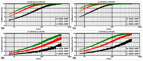 Results of Monte Carlo simulations to estimate the confidence with which we can determine the state ordering using a small number of decay-correlated time-of-flight events for Db assuming (a) isomeric excitation and -decay energy resolution of (a) 250 keV and 140 keV, (b) 50 keV and 140 keV, (c) 250 keV and 70 keV, (d) 50 keV and 70 keV. The blue circles are indicative of the previously published data set.
