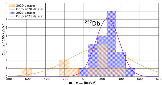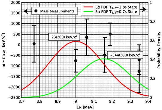 Figure 5 shows the atomic mass assigned to each of the seven time-of-flight events relative to the 2020 Atomic Mass Evaluation (AME2020) [29] value for the mass of Db, as a function of the measured energy of the alpha-decay subsequent to ion implantation. For reference, the figure also includes the PDF for each state of Db. For each event, we re-weight the atomic mass error according to Equation (5) based on the detected alpha-decay energy. When we use our previously published data set to calculate the weighted average atomic mass for the = 1.8 s state, we find it differs from the AME2020 value by = 23(260) keV/c. For the = 0.7 s state, the weighted average differs from AME2020 value by = −344(260) keV/c. This would imply the T = 0.7 s state would be the ground state. Based on our Monte Carlo simulations and a presumption that the isomeric excitation is energy is more than 50 keV but less than 350 keV, we can offer this assessment with between 53% and 67% confidence based on the 7 events observed in our first run.