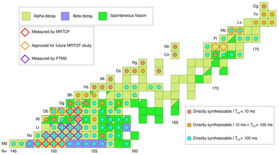 Figure 7 shows the present state of direct mass determinations among transfermium nuclides. Several isotopes of No and Lr, and one isotope of Rf, have been measured by Penning trap mass spectroscopy [8,9,10]. Four isotopes of Md and one isotope of No were measured [11] by MRTOF-MS prior to the development of the decay-correlated time-of-flight mass spectroscopy technique, while two isotopes of Db have been measured [12,31,32] using decay-correlated time-of-flight mass spectroscopy. In the near future, we plan to use decay-correlated mass spectroscopy to measure the mass of Db and search for Db, as well as to measure the mass of Sg. When the Nishina Center for Accelerator-based Science can again supply a Ca projectile beam, we will use the technique to unambiguously determine A and Z for neutron-rich Mc and Nh isotopes and provide mass anchor points for the isolated nuclides in the “hot-fusion island”.