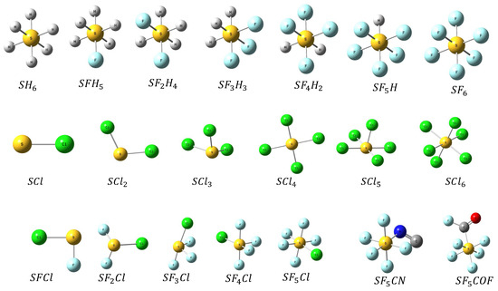 - Leiding, J.; Woon, D.E.; Dunning, T.H., Jr. Bonding and Isomerism in SFn−1Cl (n = 1–6): A Quantum Chemical Study. J. Phys. Chem. A 2011, 115, 329–341. [Google Scholar] [CrossRef] [PubMed]