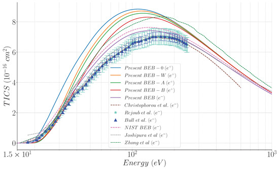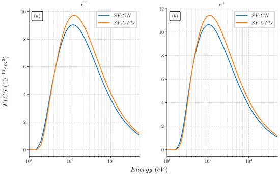 Two more targets, and , that are important for plasma applications are investigated for ionization, and the results are shown in Figure 6 for electron and positron impacts. The BEB-W model is used for the calculation of positron impact TICS for these targets, as they are polar in nature.