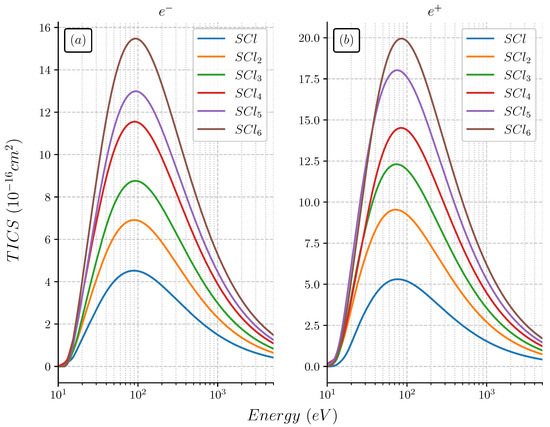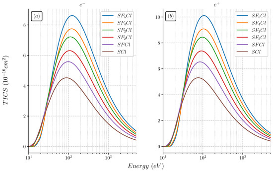 Similarly, we have calculated the TICS for another set of molecules that shows a similar behavior to previous cases, where the cross-section increases with the size of the target (number of electrons present in the target), as shown in Figure 5. For positron impact, the BEB-W model is used, as all the targets in this set are polar, and the results are shown in Figure 5b.