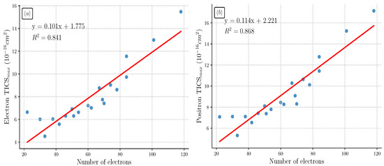In Figure 8, the maximum TICS for electrons and positrons are plotted with the number of electrons present for all the targets studied. For both cases, as the number of electrons increases, the maximum TICS also increase, indicated by a linear fit for all the targets.