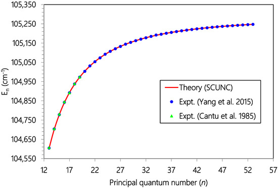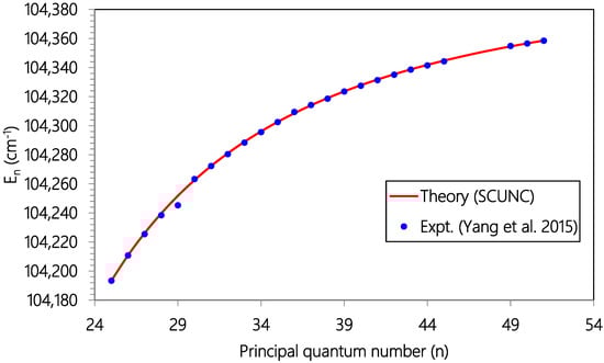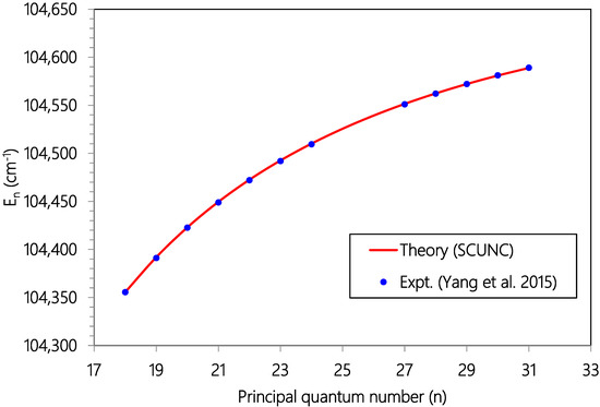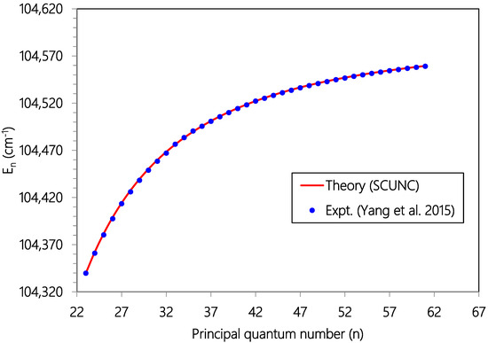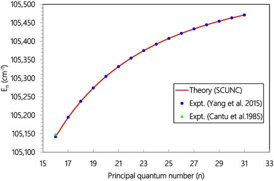In Equation (4), E∞ denotes the converging limit, R is the Rydberg constant, here, R = RCl = 109,735.6176 cm−1 represents the Rydberg constant for the Cl atom, which is obtained from the relation RCl = R∞/(1 + me/M), where R∞ = 109,737.3157 cm−1, M is the mass of Cl+, and me is the rest mass of the electron; Zcore represents the electric charge of the core ion and δ means the quantum defect. In addition, theoretical and measured energy positions can be analyzed by calculating the Z*-effective charge in the framework of the SCUNC-procedure.
