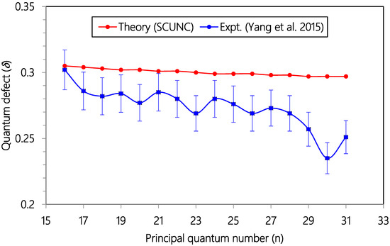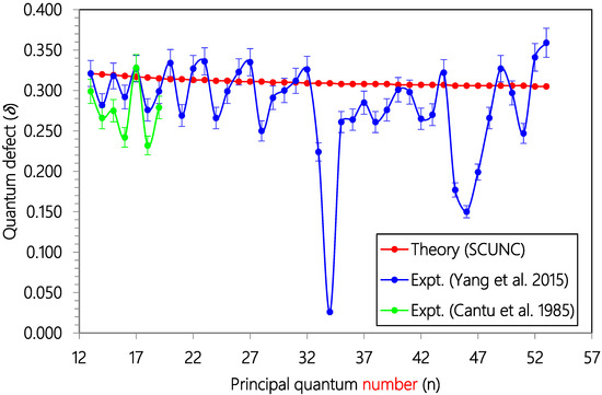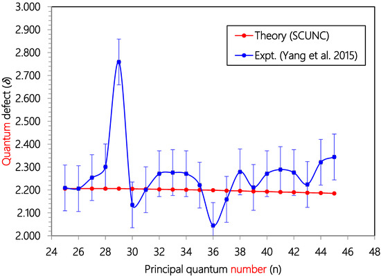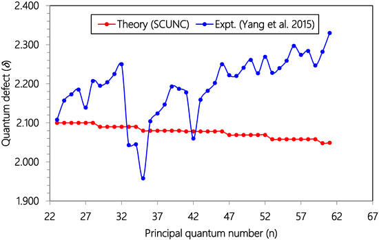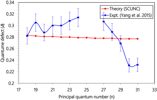 As Zcore = 1.000, = 1.101 > Zcore. Then, the quantum defect is positive. So, for all the series analyzed in this work, positive quantum defects are allowed according to the according to the SCUNC analysis conditions (11). This is verified for all the data quoted in Table 1, Table 2, Table 3, Table 4, Table 5, Table 6, Table 7, Table 8 and Table 9. Table 1 presents Resonance energies, quantum defects and effective charges of the 3s23p4 (3P2)ns (4P5/2) Rydberg series originating from the 3s23p5 2P03/2 ground stateCl and converging to the 3P2 series limit in Cl+. For this Rydberg Resonance, only the VUV-PI and VUV-PFI-PI measurements [18] are available in the literature to our knowledge. Comparison of resonance energies shows excellent agreement between theoretical data (SCUNC) and (VUV-PI and VUV-PFI-PI) measurements [18] up to n = 61, as well highlightedin Figure 1. In contrast, for quantum defects, the present SCUNC calculations provide good quantum defect behavior that is virtually constant or decreases slightly with increasing principal quantum number n up to n = 80, while experimental quantum defects vary anomalously in all directions, as shown in Figure 2. Table 2 lists resonance energies, quantum defects and effective chargesof the 3s23p4 (3P1)nd (2D5/2) Rydberg resonance series from the 3s23p5 2P03/2 ground state of atomic chlorine. As shown in Figure 3, there is an excellent agreement between the SCUNC resonance energies and the quoted measurements [18,19]. But if the SCUNC quantum defect is constant or decreases slightly with increasing principal quantum number n, the measured quantum defect varies considerably [18,19], as shown in Figure 4. It is well known that quantum defects must be constant or decrease with increasing n. Especially when n→∞, we obtain a hydrogen-like system for which the quantum defect is zero. Table 3 and Table 4 present the resonance energies, quantum defects and effective charges of the 3s23p4 (3P1)ns (2P3/2) and of the 3s23p4 (3P1)nd (2D5/2) Rydberg originating from the 3s23p5 2P03/2 ground state of Cl and converging to the 3P1 series limit in Cl+. Once again, the SCUNC results agree excellently with all the experimental resonance energies up to n = 34 (Table 3) and up to n = 23 (Table 4). These good agreements allow us to consider as accurate the extrapolated SCUNC data up to n = 70. Comparisons of quantum defects indicate irregular behavior of the experimental values in contrast with the SCUNC quantum defect varying correctly up to n = 70. Table 5 and Table 6 list resonance energies, quantum defects and effective charges calculated for the 3s23p5 2P03/2 → 3s23p4 (3P0)ns (2P1/2) and the 3s23p5 2P03/2 → 3s23p4 (3P0)nd (2P3/2) Rydberg resonance series. For the 3s23p4 (3P0)ns (2P1/2) series, experimental data are presented in Table 5 up to n = 21 with missing energy positions for n = 12, 17 18, 20. SCUNC data associated with a nearly constant quantum defect at around 2.08 are provided for the missing experimental resonance energies [18,19]. In addition, the good behavior of the SCUNC quantum defect is observed up to n = 70 allowing us to consider the extrapolated news resonance energies as correct. Table 6 indicates resonance parameters of the 3s23p4 (3P0)nd (2P3/2) series. Here again, very good consistency is obtained between the theoretical and the experimental resonance energies up to n = 31 as shown in Figure 5. New resonance energies associated with an almost constant quantum defect are tabulated for high-lying states n = 32–70 (see Figure 6). Table 7, Table 8 and Table 9 compare resonance energies and quantum defects, respectively of the 3s23p4 (3P0)nd (2P3/2), 3s23p4 (3P1)ns (2P3/2) and 3s23p4 (3P2)ns (4P3/2) Rydberg series. Comparison shows reasonably good agreement between resonance energies for all the considered series as highlighted in Figure 7 and Figure 8. For the 3s23p4 (3P0)nd (2P3/2) series presented in Table 7, the absent experimental resonance energies for n = 25 and 26 [18] and that for the 3s23p4 (3P1)ns (2P3/2) series quoted in Table 8 for n = 46, 47 and 48 were calculated via the present formalism. As far as quantum defects are concerned, for the above series, the SCUNC data remain again virtually constant up to n = 70 in contrast with the measured [18] as shown in Figure 9 and Figure 10. For all the series investigated in this work, the effective nuclear charge decreases the monotony toward the value of the electric charge of the core ion Zcore = 1.0.