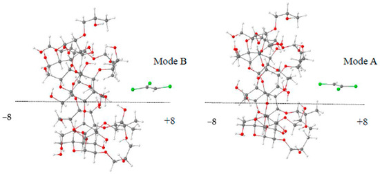 Density functional theory computations were carried out using the ORCA program (version 5.0.0) [39,40]. The starting structure of β-CD was retrieved from its crystal structure [41], and the HP-β-CD structure was built by adding hydroxypropyl groups to β-CD. The full geometry optimization of the complexes formed between trichloroethylene (TCE) and the CDs (β-CD and HP-β-CD) was conducted in the gas phase by employing the BLYP-D4 functional [42,43,44], along with the def2-SVP basis set. To account for the basis set superposition error (BSSE), a geometrical counterpoise correction scheme (gCP) [45] was applied. The approach suggested by Liu and Guo was used [46] to create initial complexes. The center of the coordination system was set at 0 Å for both TCE and HP-β-CD or β-CD. Subsequently, the TCE molecule was systematically translated along the Z-axis from −8 to +8 Å with a step size of 2 Å, involving two possible inclusion modes: mode A, where TCE approached the wider rim of β-CD and HP-β-CD cavities by its ClCH group, and mode B, where it approached through the dichlorocarbene group (CCl2). These modes are depicted in Figure 1 using the Jmol version 14.32.60 [47].