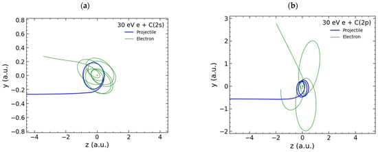 On the other hand, as the impact energy decreases the chance of having a transient negative ion increases. The negative ion of carbon has two bound states, the ground state 2s22p3 4S0 and the excited state 2s22p3 2D0 [19]. From the classical point of view, and in contrast to the prediction of quantum mechanics, atoms or ions with two or more bound electrons autoionize without the need for any external agent. Different alternatives have been proposed to avoid this spurious autoionization in target systems, like the Bohr atom [20], the neglect of the e-e interaction [21], the backward-forward propagation scheme [22], and the introduction of momentum-dependent stabilizing potential terms to the Hamiltonians [23,24,25,26,27,28,29]. In contrast, in this case, the duration of the transient C− ion and the fraction of such events is expected to depend on the projectile electron energy. Therefore, it is hard to infer firsthand the role that the e-e interaction might have on the electron emission process. Hence, at this stage we inspect the transient lifetime of C− ions, that is the lapse of time that the three-body system conforms to a C− ion during collision events. In Figure 6 we show the obtained results for the 2p and 2s states at an impact energy of 30 eV, which reveal that these negative ions last for less than 1 a.u. of time.