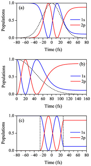 As the amplitude does not appear in the first two of Equation (4), the dynamics of the 1s and 2p states within the three-level model is formally decoupled from the dynamics of continuum states. The equations for these two states can be written in the matrix form