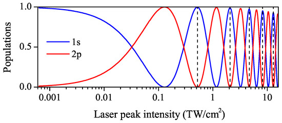 Figure 2 shows the final populations of the states 1s and 2p as functions of in the domain of – W/cm. Again, in agreement with the area theorem, for each peak intensity the final populations of atomic states for the considered three pulses have the same values. Due to this fact, the blue and red lines in Figure 2 represent the populations of the ground and excited states, respectively, obtained for all three pulse shapes. The vertical dashed lines indicate the peak intensities at which an integer number of Rabi cycles during the pulse is completed: TW/cm for , respectively.