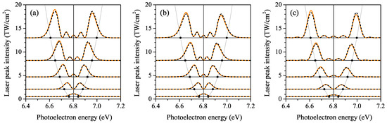 (Color online) Photoelectron energy spectra calculated using the three-level model (Equations (4)–(6)) with exact values of (solid orange lines) and with the approximation (dashed lines) for: (a) Gaussian pulse (7), (b) half-Gaussian pulse (8) and (c) rectangular pulse (9), all of carrier frequency and the peak intensities marked in Figure 2 by vertical dashed lines. Black dots mark the real parts of , whose separation (≈) estimates the splitting of the resonant peak.