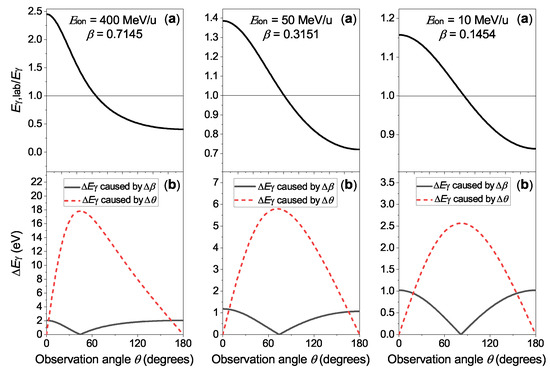 According to Figure 1, the choice of a specific observation angle implies a trade-off between the imperfect knowledge of the ion beam velocity and the geometry of the experimental setup, i.e., the observation angle. In particular, as the gradient of the angular-dependent Doppler shift vanishes at and , these angles are insensitive to a minor misalignment of the detector with respect to the ion beam axis. On the other hand, the uncertainty contribution due to reaches its maximum values at these observation angles. Conversely, there is a ’magic angle’ where the contribution vanishes, while the sensitivity of the reconstructed rest-frame photon energy on the observation angle is maximally pronounced. This angle is located at in the limit of and is shifted into the forward direction for increasing beam velocities.