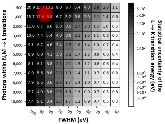 Ongoing efforts in the field of hard X-ray spectroscopy aim to push the accuracy of L → K transition energy measurements in systems with high atomic numbers Z beyond the limit necessary for accessing higher-order QED effects on the ground state energy, the evaluation of which has been recently completed for a hydrogen-like system as a result of very extensive theoretical work [11]. For the highest quasi-stable system, namely uranium, this requires an uncertainty below 1 eV at a transition energy of roughly 100 keV, i.e., . Thus, the typical uncertainties of the reconstructed photon energy depicted in Figure 1 are too large to achieve this goal.