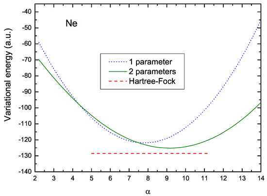 It should be noted that in order to obtain meaningful results from the variational method, the trial wave functions must be orthogonal. For this reason, the and orbitals must have the same variational parameter. However, this restriction does not apply to the orbitals since the orthogonality with s states is guaranteed by the corresponding angular integrals. This degree of freedom is quite useful for obtaining a better variational solution, as will be shown here.