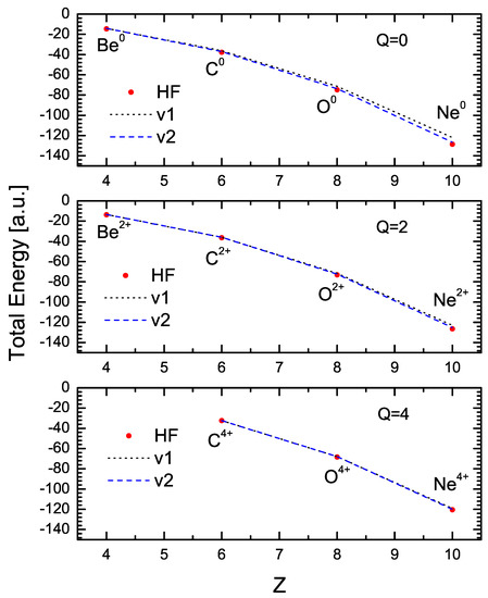 , the one-parameter V1 curve deviates significantly from the HF one but shows an improvement for higher charge states. The two-parameter V2 curves show an excellent agreement with the HF values in all cases. On the other hand, the BK curves show deviations from the more correct values.
