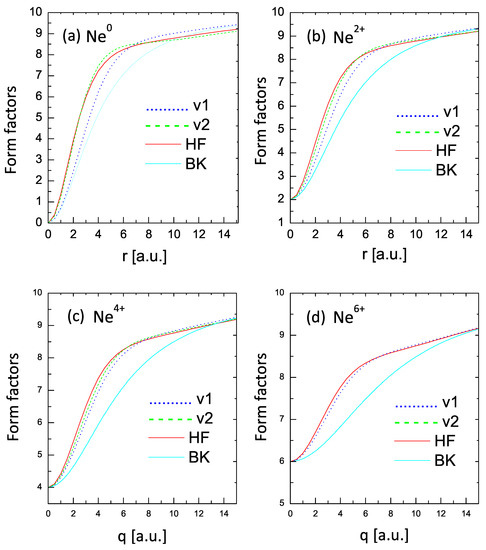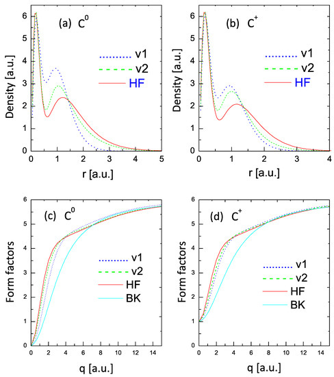 . The curves in panels (a) and (b) show significant differences in the electron densities with respect to the HF results (with some mild improvement in the V2 curves). However, the corresponding form factors shown in panels (c) and (d) provide a distinct view. The form factor obtained from the V1 formulation compares fairly well (considering the simplicity of the approach) with the HF form factor, while the V2 curve shows an almost excellent comparison with the HF curve.