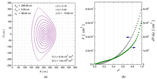 Figure 5a shows the poloidal cross-section of magnetic surfaces, i.e., the nested isolines of the normalised poloidal radius calculated on the basis of magnetohydrodynamic equilibrium data for the DEMO-FNS project [34] for a candidate operating regime used herein as a sample case. Either analytical equilibria such as the Soloviev solution [35] of the Grad–Shafranov equation or numerical magnetohydrodynamic codes such as [36] can be employed. The values and in Figure 5a refer to the magnetic axis position, is the horizontal minor radius, the values , , and correspond to the elongation, triangularity and the Shfranov shift calculated for the last closed flux surface (LCFS), denotes the volume enclosed by the LCFS, and is the LCFS area. The functions of the volume enclosed by magnetic surfaces and its derivative, with respect to the normalised poloidal radius, are shown in Figure 5b versus the normalised poloidal radius defined by (1).
