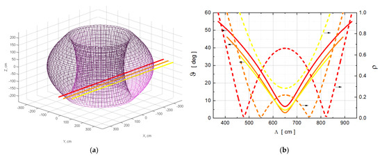 (a) LCFS and three injection lines corresponding to three different target points or tangency radii R = 2056 mm (red), R = 2481 mm (orange), R = 2906 mm (yellow); (b) Values of the effective radius (dashed curves, right scale) and the injection angle (solid curves, left scale) along the three injection lines versus the distance along the corresponding line.