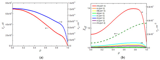 Plasma parameters used in calculations of neutral beam penetration: (a) Electron temperature (red curve, left scale) and electron density (blue curve, right scale); (b) Effective charge (dashed curve, left scale) and impurity ion densities (solid curves, right scale).