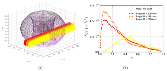 (a) Approximation of finite width neutral beams by a large number of mathematical lines. The central injection lines correspond to those shown in Figure 6a; (b) Source functions of fast ions produced by neutral beams depicted by the corresponding colours.