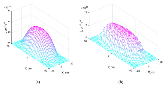 (a) Initial neutral particle current density distribution over the beam cross-section; (b) Residual neutral particle current density distribution over the beam cross-section (shine-through) for the beam with tangency radius R = 2056 mm corresponding to the red colour in Figure 8a.