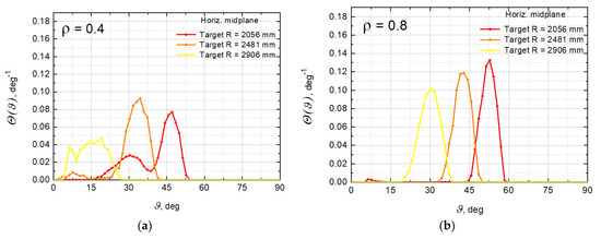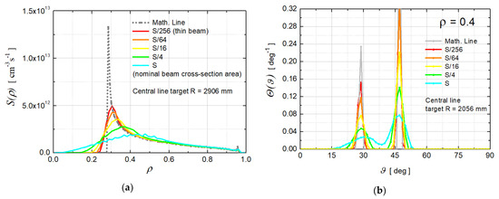 The angular distribution of the source function at each magnetic surface is calculated as a histogram of the values of the angle between the injection line and the magnetic field at the point where the beam atom undergoes the electron loss. Figure 11a,b show the obtained angular distributions at and at respectively. Angular distributions of the source of fast ions in the plasma noticeably depend on the beam injection geometry as well.