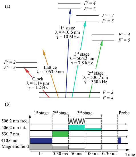 Thus, a deeper cooling of thulium atoms is preferable to solve both of these problems. The minimal temperature attainable with Doppler cooling is related to the linewidth of cooling transition according to the relationship , where h—the Planck constant, and —the Boltzmann constant. The first transition used for laser cooling of Tm atoms is the transition at the wavelength of (“blue”, 1st stage magneto-optical trap, MOT, Figure 1a) with the natural linewidth of . While Doppler limit for this transition equals , it is possible to work in a sub-Doppler regime with temperatures as low as . However, the atomic cloud in this case becomes larger with lower number of atoms. The second laser cooling transition has the wavelength of (“green”, 2nd stage MOT, Figure 1a) and the linewidth of . The recapture efficiency from the first stage MOT is close to 100%, and the Doppler limit equals .